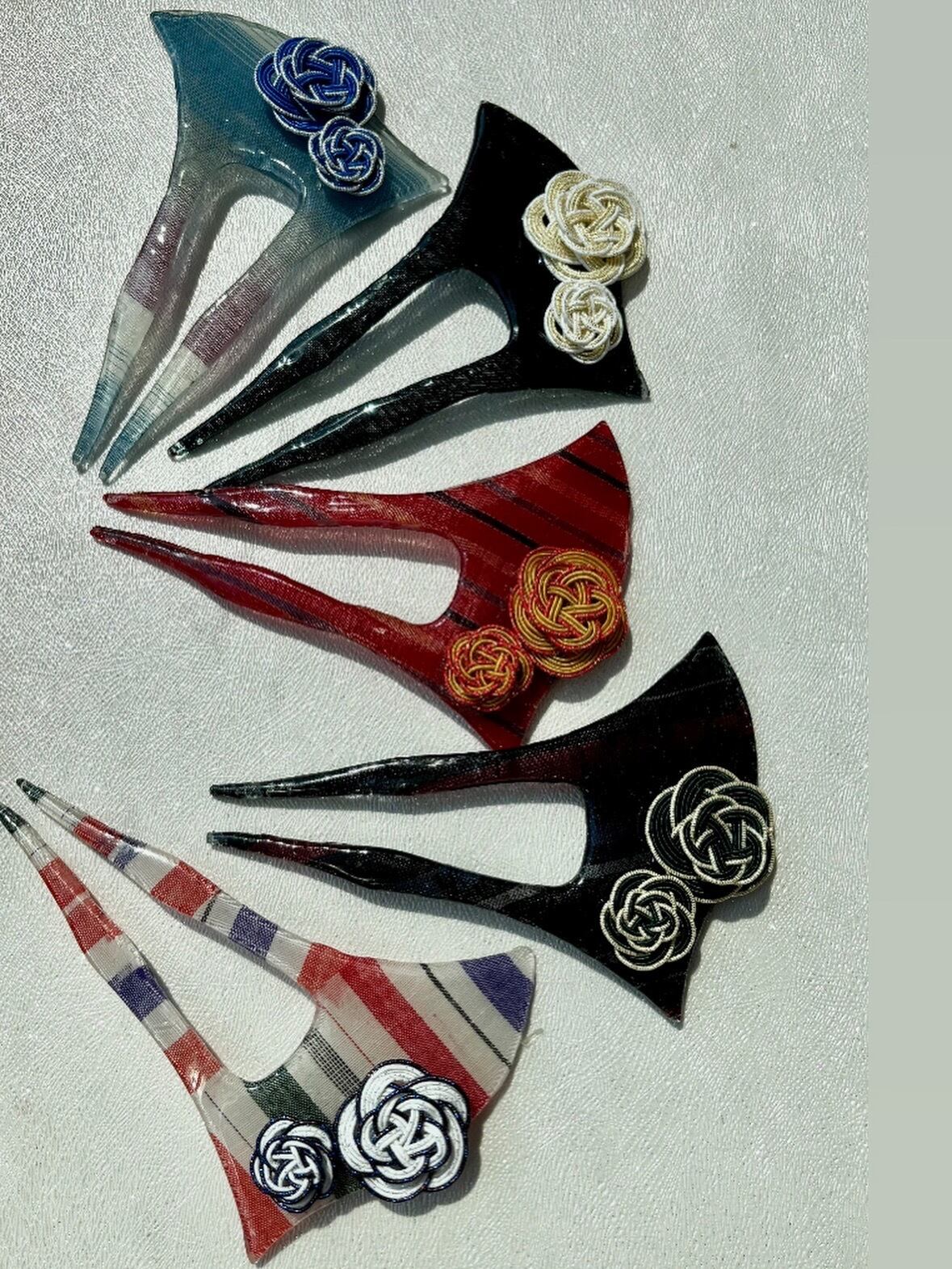 蓮華結かんざし Dは、様々な色の糸が織りなす遠州綿紬と美しい水引を使用したかんざしです。このアイテムは、心を結ぶデザインで、祭典や和服に華やかさを添える存在感があります!
