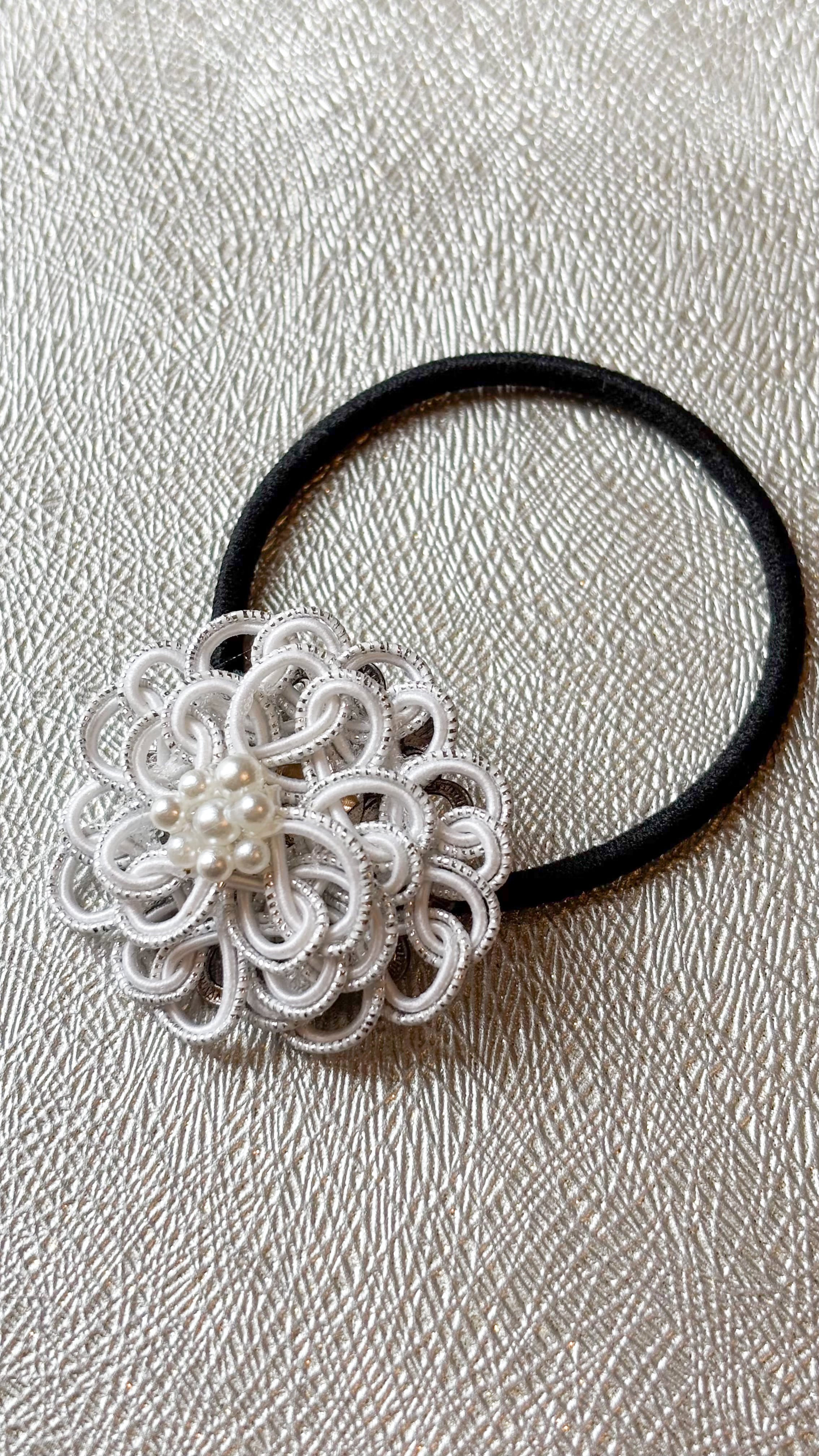 華ヘアゴムEは、シルバーと白の清らかな水引を使用した上品なデザインが特徴の魅力的なアクセサリーです。この特別なアイテムは、通常の生活シーンからお祝いの場面まで、幅広くあなたのスタイルを引き立てる存在となります!