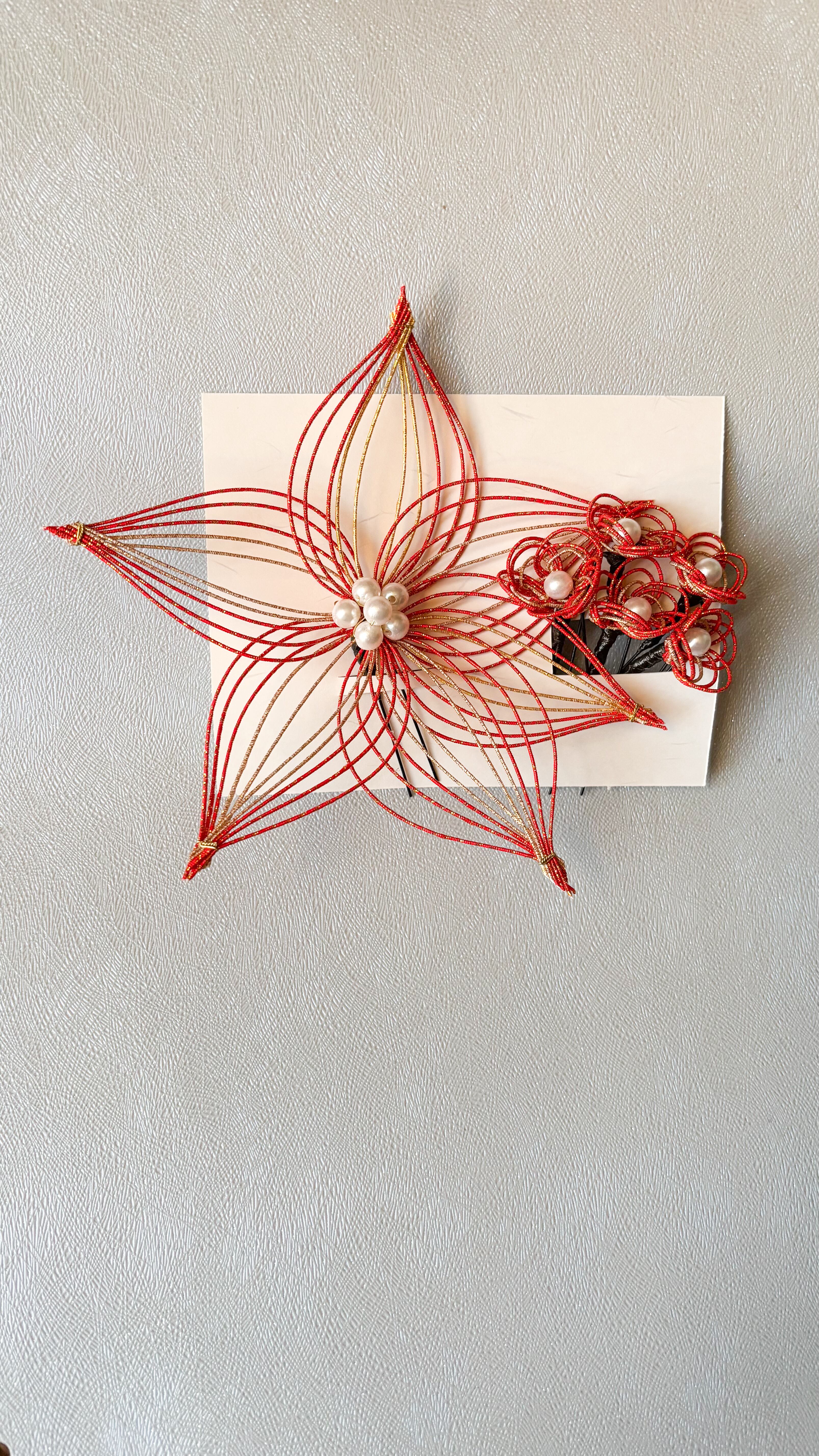 鮮やかな赤と煌めく金のコンビネーションが、髪に華やかさを添え、特別な瞬間を引き立てます。一つ一つ丁寧に作り込まれているため、結婚式やお祝い事などの特別なシーンにもぴったりです。周囲の視線を惹きつける素敵な瞬間を、ぜひお楽しみください!